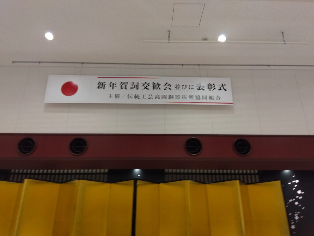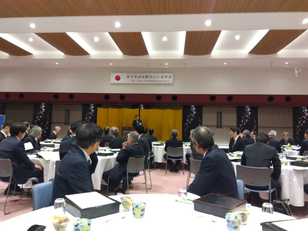 2026年1月5日(月)伝統工芸高岡銅器振興協同組合主催による「令和八年 新年賀詞交歓会 」が高岡商工会議所2階で開催され、当組合理事長をはじめ組合員が参加した。
